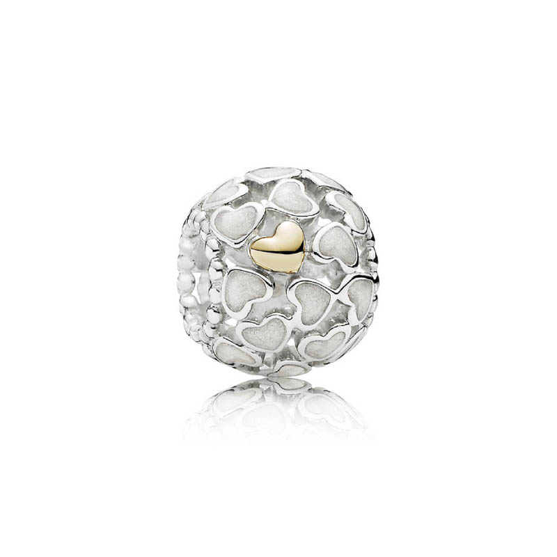 Un dije calado decadente, acabado a mano por Pandöra, elaborado en plata esterlina con dos corazones de oro de 14k y esmalte plateado reluciente.