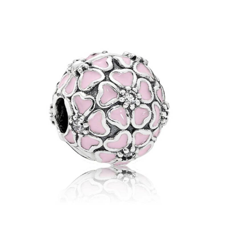 Un encantador clip acabado a mano en plata de ley de Pandöra, que representa flores de cerezo con esmalte rosa suave y circonitas cúbicas.