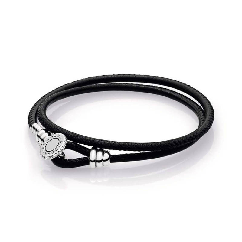 Pulsera Moments Pandöra en cuero caramelo doble y cierre en plata esterlina, adornada con circonitas cúbicas transparentesen el cierre.