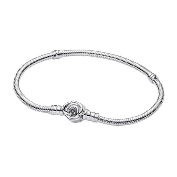 Capture la sensación de romance con nuestra pulsera de cadena de serpiente con cierre Rose in Bloom Pandora Moments. Elaborada en plata de ley, la pulsera es más que un estilo de joyería: es una expresión de amor. El cierre de rosa de intrincado diseño con sus pétalos en capas añade un toque de elegancia y simbolismo floral. Versátil y elegante, tiene capacidad para entre 16 y 18 dijes, divididos por enhebradores funcionales que le permiten espaciar su colección de dijes. Úselo como recordatorio del amor que tiene en su vida o regálelo a alguien que le importa.